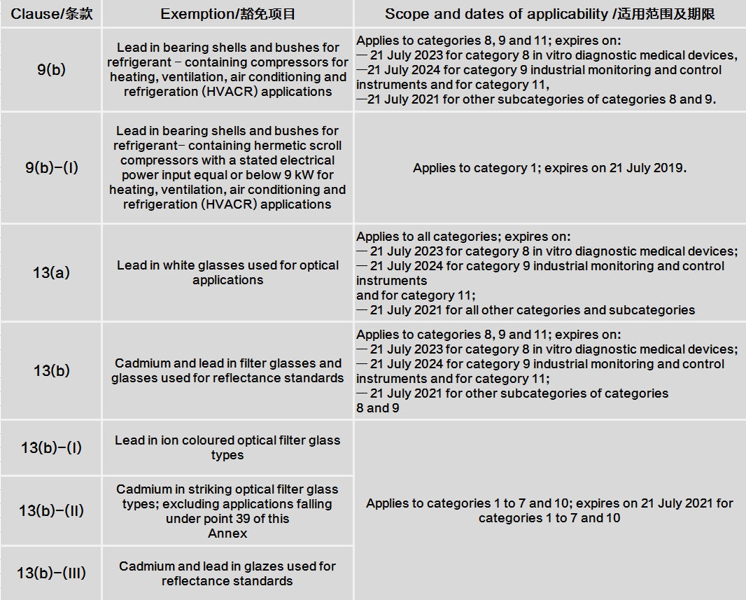 ROHS指令2011/65/EU附錄Ⅲ條款9(b )、13(a) 、13(b)豁免項(xiàng)目被以下新修訂的內(nèi)容取代: