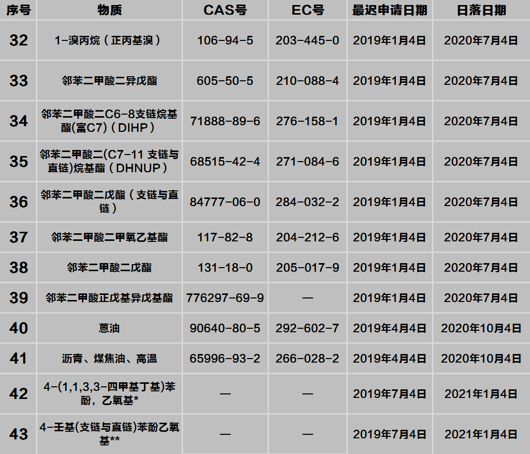 REACH法規(guī)附錄XIV(授權(quán)清單)新增項(xiàng)目:
