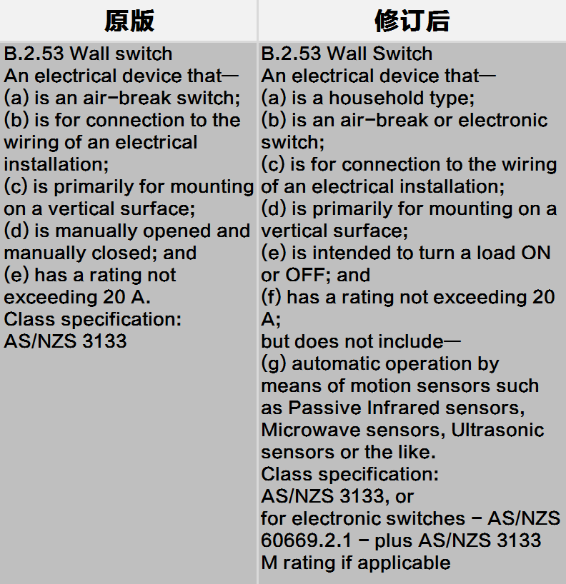 2017年6月30日,澳大利亞標(biāo)準(zhǔn)局發(fā)布AS/NZS 4417.2:2012+A4:2017修訂版,對墻壁開關(guān)的認(rèn)證要求做出了修訂(見下表)。強制生效日期是2018年6月1日。