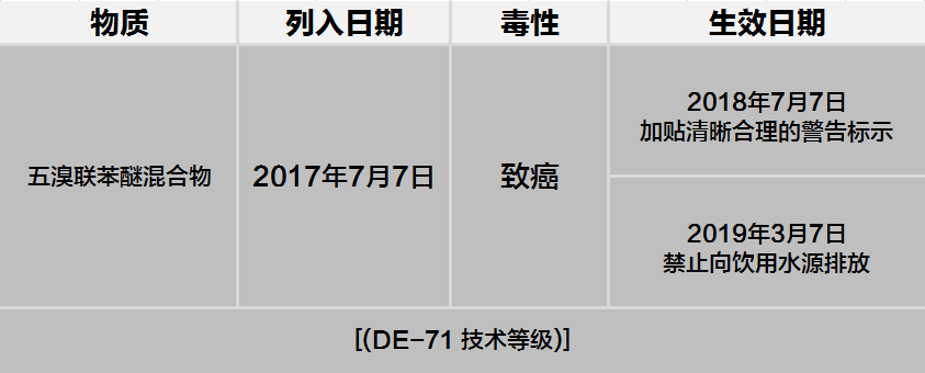 2017年7月7日,加利福尼亞州健康環(huán)境危害評估辦公室(OEHHA)將五溴聯(lián)苯醚混合物〔5-PBDE,DE-71(技術(shù)等級)〕加入加州65提案(《1986飲用水安全與毒性物質(zhì)強(qiáng)制執(zhí)行法》)的物質(zhì)清單中,因其是一種致癌的化學(xué)物質(zhì)。