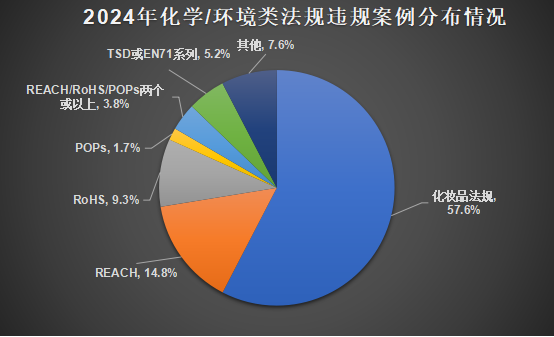 2024年歐盟非食品類消費(fèi)品的快速警報系統(tǒng)(RAPEX)累計通報4154列違規(guī)產(chǎn)品,同比2023年增長21.9%,涉及化學(xué)及環(huán)境風(fēng)險的案例有2157例,同比2023年增長11.8%,被通報的產(chǎn)品類型涉及電器電子產(chǎn)品、玩具、飾品等多種消費(fèi)品,其中對于RoHS、REACH、POPs環(huán)保法規(guī)的執(zhí)法力度明顯增強(qiáng)。