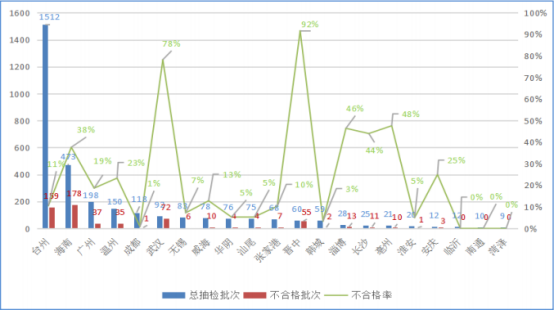 ● 不合格率高的市為:晉中、武漢、亳州、淄博