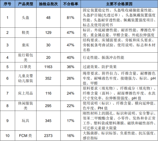 ● 不合格率高的產(chǎn)品類型包括:頭盔、鞋類、童床、口罩類、旅行箱包類、兒童及嬰幼兒服裝,休閑服裝類以及玩具