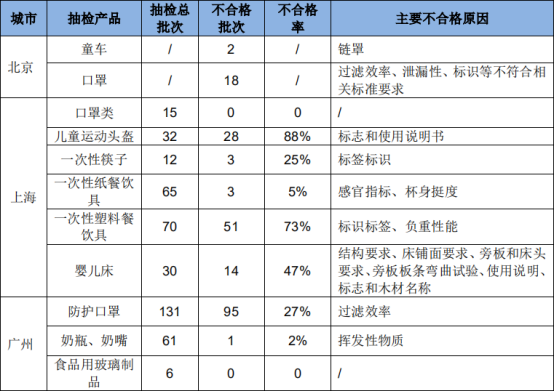 在收集到的北上廣深一線城市第三季度抽檢數(shù)據(jù)中,深圳未公布抽檢數(shù)據(jù)未納入分析。北京抽檢的產(chǎn)品主要為口罩類和童車,因只公布了抽檢不合格批次,未公布抽檢總批次,故數(shù)據(jù)同樣未納入統(tǒng)計中。