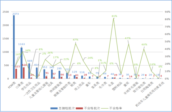 從收集到的抽檢數(shù)據(jù)可以看到,第三季度抽檢重點除了以往常見的食品相關(guān)產(chǎn)品、學(xué)生用品、一次性衛(wèi)生用品、兒童及嬰幼兒服裝、玩具等,受新冠疫情以及國家公安部發(fā)布的“一盔一帶”的影響,口罩和頭盔也成為重點抽檢產(chǎn)品,并且這兩類產(chǎn)品的不合格率分別高達(dá)81%和36%。