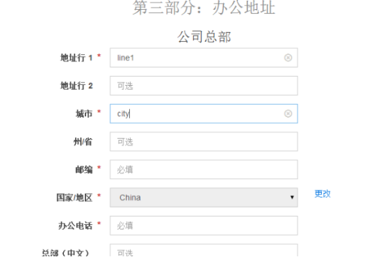 注意:辦公地址的填寫中除去總部與個(gè)人地址其余信息必須填寫英文!