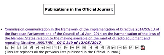 目前不是所有產(chǎn)品的無線標準都在RED指令的協(xié)調標準中,歐盟針對RED指令的協(xié)調標準,在不斷的更新中,最近一次更新在2017年5月12日。