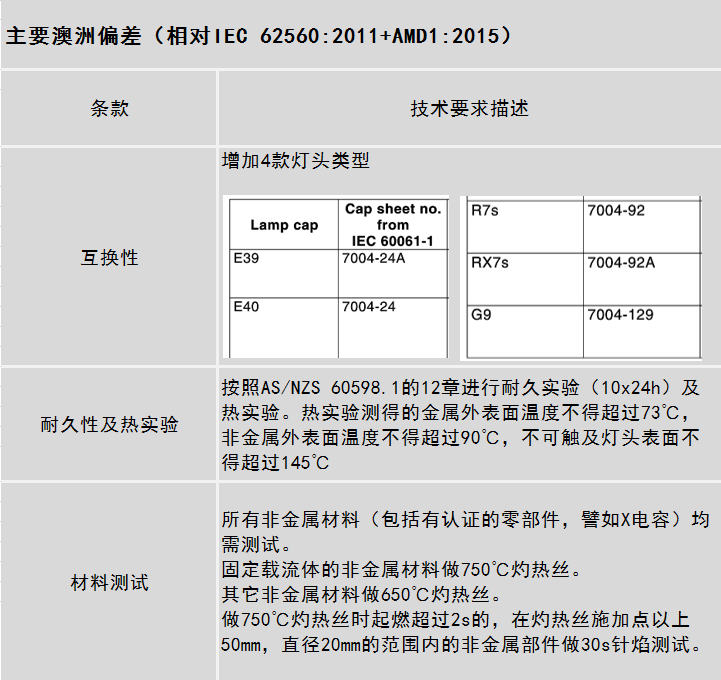 澳洲普通照明用50V以上自鎮(zhèn)流LED燈安全要求從2018年3月14日起強(qiáng)制實(shí)施,目前與前一版本并行使用。建議設(shè)計(jì)生產(chǎn)相關(guān)產(chǎn)品的客戶提前準(zhǔn)備,按照新標(biāo)準(zhǔn)進(jìn)行評(píng)估、測試和認(rèn)證。
