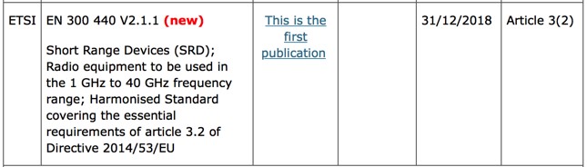此次更新新增了2個(gè)產(chǎn)品類的無(wú)線標(biāo)準(zhǔn),包括常用的短距離無(wú)線通信產(chǎn)品的協(xié)調(diào)標(biāo)準(zhǔn)ETSI EN300 440: