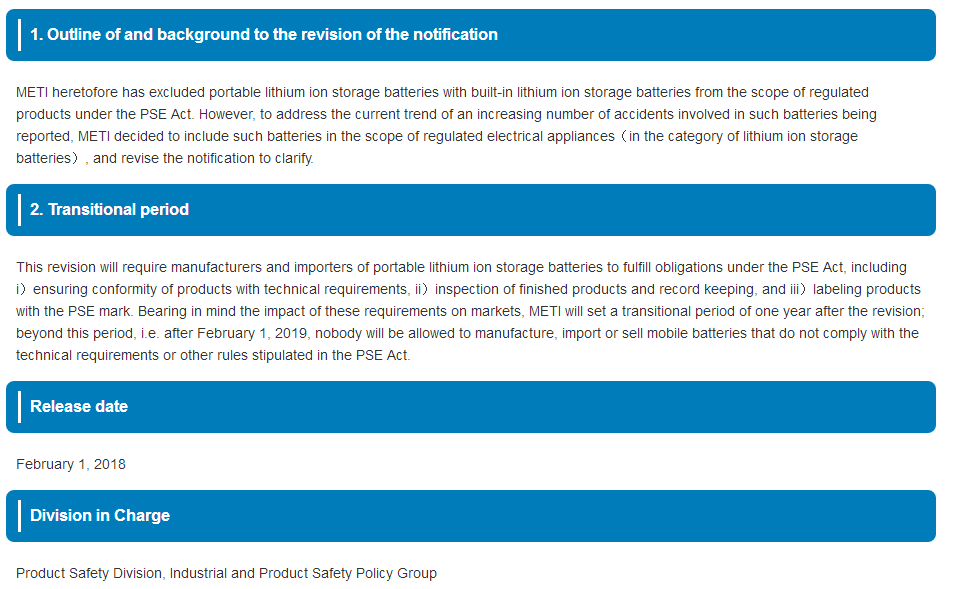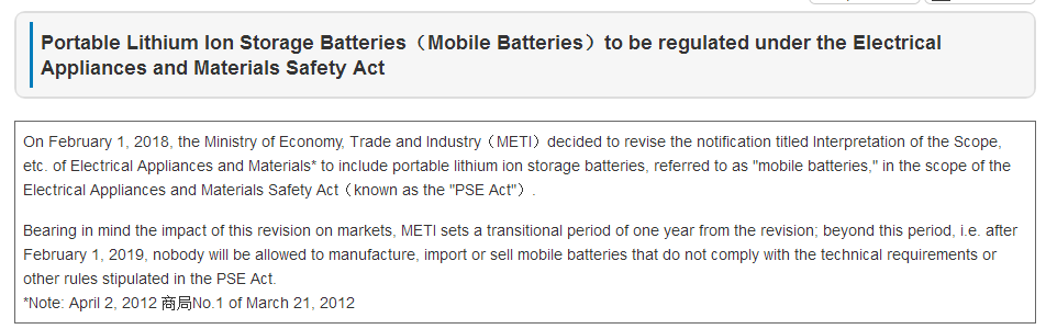 2018年2月1日,日本經(jīng)濟(jì)產(chǎn)業(yè)省METI發(fā)布公告,針對(duì)圓形PSE管控對(duì)象的鋰電池范圍進(jìn)行了內(nèi)容修訂。新增便攜式電器的鋰電子電池和便攜式電池組為圓形PSE管控對(duì)象。