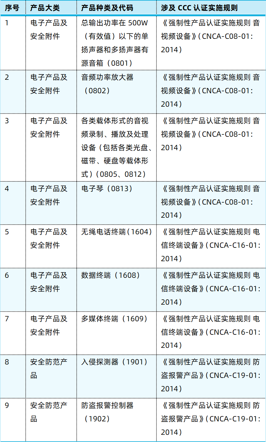 二、《強制性產(chǎn)品認(rèn)證實施規(guī)則 音視頻設(shè)備》(CNCA-C08-01:2014)和《強制性產(chǎn)品認(rèn)證實施規(guī)則 電信終端設(shè)備》(CNCA-C16-01:2014)適用范圍刪除相關(guān)產(chǎn)品;廢止《強制性產(chǎn)品認(rèn)證實施規(guī)則 防盜報警產(chǎn)品》(CNCA-C19-01:2014)。