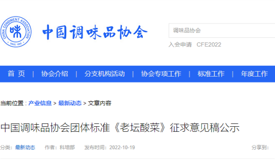 由中國(guó)調(diào)味品協(xié)會(huì)提出,并歸口的團(tuán)體標(biāo)準(zhǔn)《老壇酸菜》形成標(biāo)準(zhǔn)征求意見(jiàn)稿(見(jiàn)附件1),現(xiàn)予以公示。各有關(guān)單位如有意見(jiàn),請(qǐng)?zhí)顚?xiě)標(biāo)準(zhǔn)征求意見(jiàn)表(見(jiàn)附件2),并于2022年11月20日前反饋至中國(guó)調(diào)味品協(xié)會(huì)團(tuán)體標(biāo)準(zhǔn)技術(shù)委員會(huì)秘書(shū)處。
