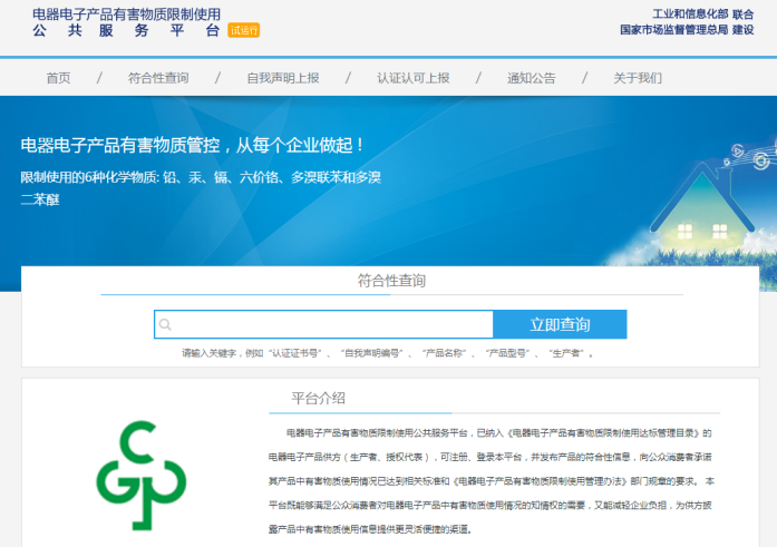 2019年10月8日,由工業(yè)和信息化部聯(lián)合國家市場監(jiān)督管理總局建設的電器電子產(chǎn)品有害物質限制使用公共服務平臺已上線并進行試運行。