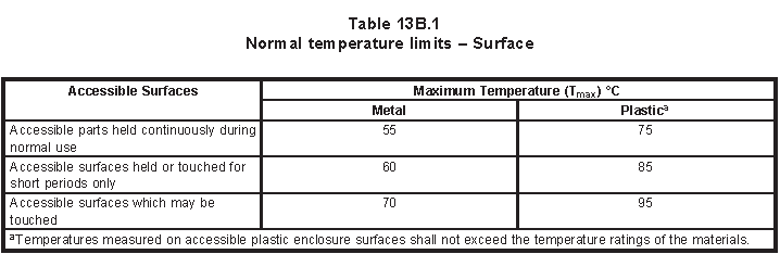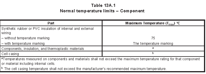 輸出放電溫升測(cè)試:用電阻做負(fù)載, 把放電電流控制在過(guò)流保護(hù)不動(dòng)作情況下最大放電電流直到熱穩(wěn)定或者電壓將至最低電壓其中一個(gè)現(xiàn)象并且不能超過(guò)下圖表的溫度限值。