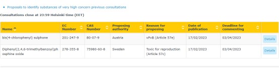 2023年2月17日,歐洲化學品管理局(ECHA)對2種潛在的SVHC候選清單物質展開公眾咨詢,公眾咨詢將于2023年4月3日結束,在此期間各利益相關方均可向ECHA提交反饋意見。ECHA將會對公眾提交的反饋意見進行評議,最終確定正式納入第29批SVHC候選清單的物質。