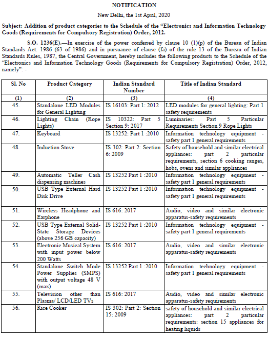 2020年4月1日, 印度電子和信息技術(shù)部公布第4 批共12項(xiàng)產(chǎn)品納入《電子和信息技術(shù)產(chǎn)品(強(qiáng)制注冊(cè)要求)命令,2012》強(qiáng)制管制清單。