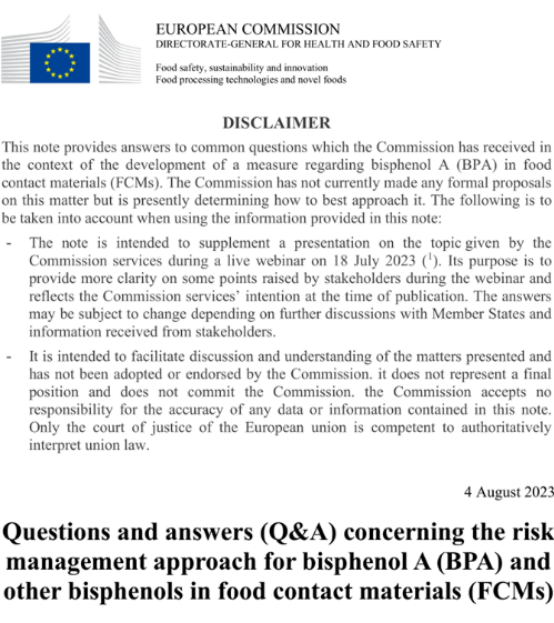 2023年8月4日,歐盟委員會發(fā)布了《食品接觸材料中雙酚A(BPA)和其他雙酚類物質(zhì)風(fēng)險管理方法的問答》,具體如下: