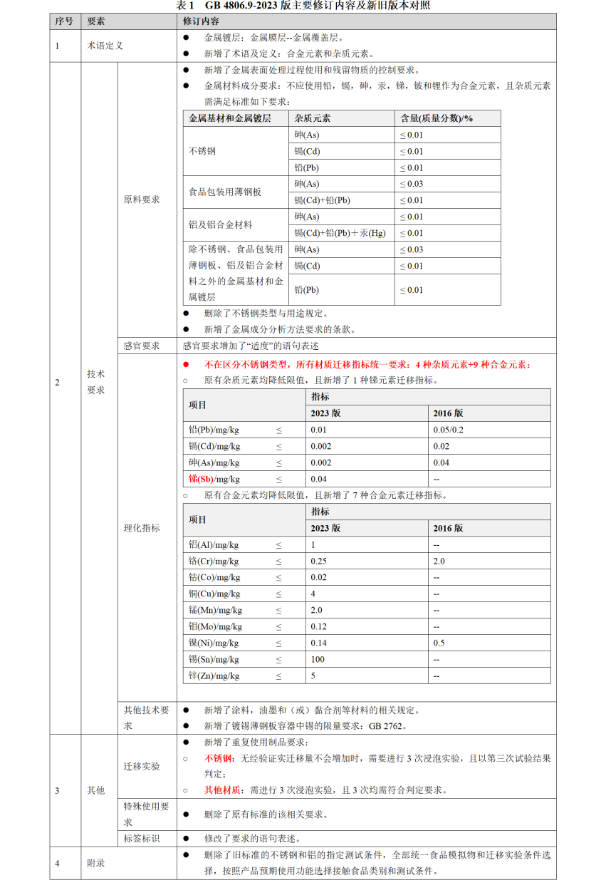 一﹑GB 4806.9-2023 食品接觸用金屬材料及制品