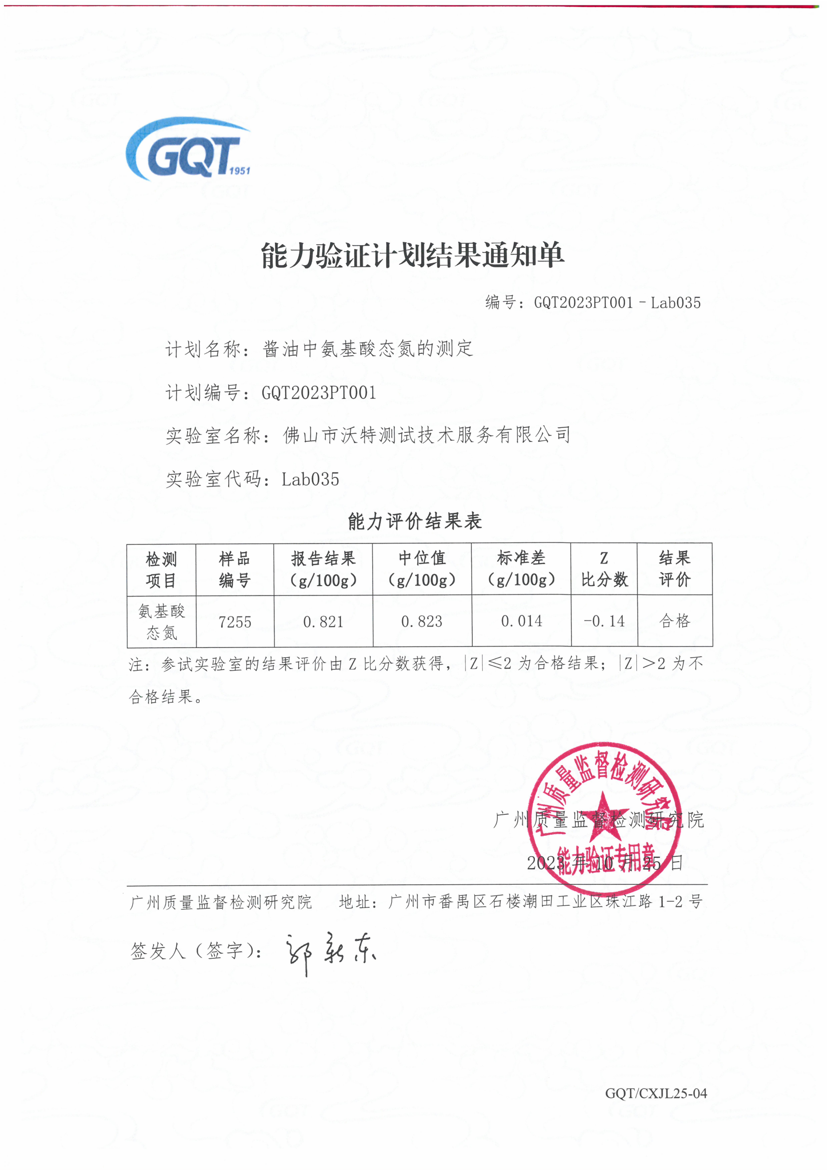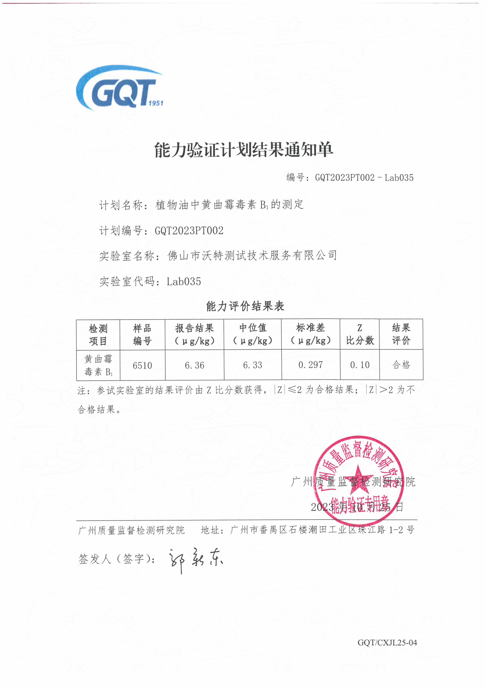 近日,佛山市沃特測(cè)試技術(shù)服務(wù)有限公司參加廣州質(zhì)量監(jiān)督檢測(cè)研究院組織的GQT2023PT001醬油中氨基酸態(tài)氮的測(cè)定、GQT2023PT002植物油中黃曲霉毒素B1的測(cè)定,能力評(píng)價(jià)結(jié)果為「合格」。