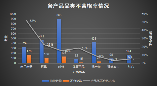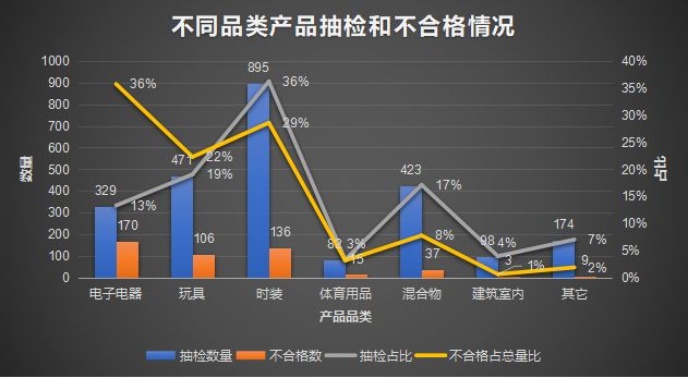 在這些抽檢的產(chǎn)品品類中,抽檢品類數(shù)量占比最高的是時裝類(占抽檢總量36%),其次為玩具(19%)和混合物(17%)以及電子電器(13%)。不合規(guī)率最高的產(chǎn)品類別是電子電器產(chǎn)品(占所有品類的36%),其次是時裝(29%)和玩具(22%)。