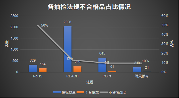 不符合最多的法規(guī)為RoHS指令(約50%),其次是REACH法規(guī)附錄XVII(13%)、玩具指令(10%)和POPs法規(guī)(9%)。除此之外,30%的產(chǎn)品未履行REACH SVHC候選清單物質(zhì)的告知義務(wù)。