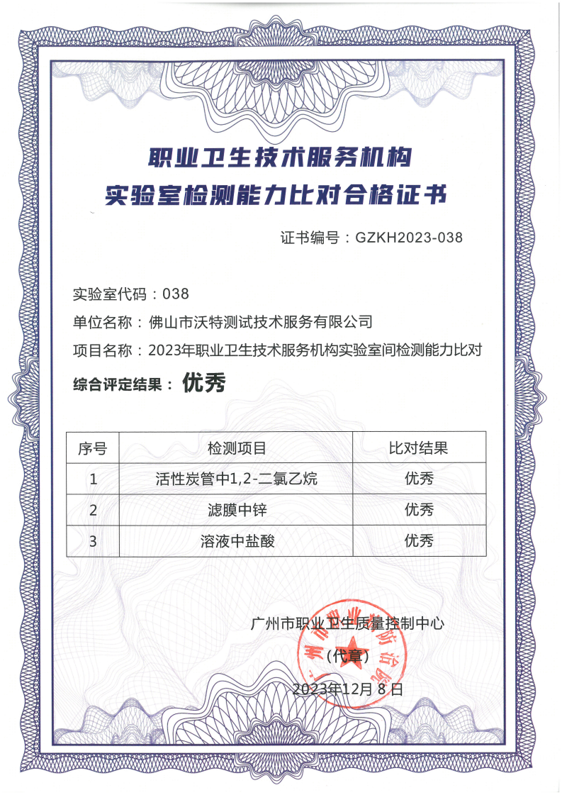 優(yōu)秀!優(yōu)秀!優(yōu)秀!佛山沃特參加2023年職業(yè)衛(wèi)生技術(shù)服務(wù)機(jī)構(gòu)實(shí)驗(yàn)室檢測(cè)能力比對(duì) 獲“優(yōu)秀”