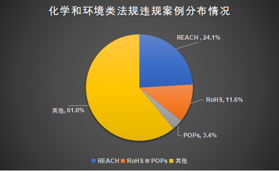 違規(guī)案例中涉及化學(xué)和環(huán)境的違規(guī)案例共計(jì)約1929例,其中違反REACH法規(guī)的案例有464例,占比約24.1%,違反RoHS指令的案例有224例,占比約11.6%,違反POPs法規(guī)的案例有65例,占比約3.4%。