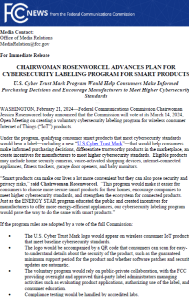 美國(guó)FCC發(fā)布物聯(lián)網(wǎng)安全標(biāo)簽“Cyber Trust Mark”計(jì)劃