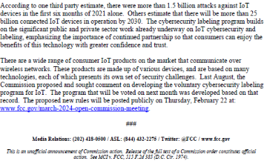 2024年2月21日,美國(guó)聯(lián)邦通信委員會(huì)主席Jessica Rosenworcel宣布,該委員會(huì)將在2024年3月14日的公開(kāi)會(huì)議上就為無(wú)線(xiàn)消費(fèi)者物聯(lián)網(wǎng)(IoT)產(chǎn)品創(chuàng)建自愿性網(wǎng)絡(luò)安全標(biāo)簽計(jì)劃進(jìn)行投票。
