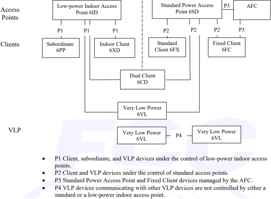 · P1低功耗室內(nèi)接入點(diǎn)控制下的客戶端、下級(jí)和VLP設(shè)備。 · P2客戶端和VLP設(shè)備在標(biāo)準(zhǔn)接入點(diǎn)的控制下。 · P3由AFC管理的標(biāo)準(zhǔn)電源接入點(diǎn)和固定客戶端設(shè)備。 · P4與其他VLP設(shè)備通信的P4 VLP設(shè)備不受標(biāo)準(zhǔn)或低功耗室內(nèi)接入點(diǎn)的控制。 |