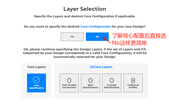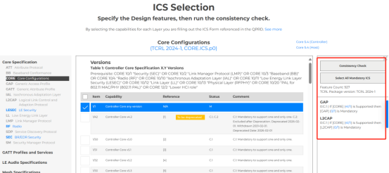 c) 下一步的“ICS選擇ICS Selection”,跟以前最大的區(qū)別就是:任何一層配置如有解鎖,都必須要重新測試提供測試證據(jù)。舊版的ICS選擇是可以做減法的,就是不支持是可以自由刪除它不支持,也不需要重新測試。新版的這種變化,導(dǎo)致了列名出現(xiàn)好多的問題,比如說,芯片廠的芯片功能支持BR/EDR/LE雙模,但給到下游終端客戶時只用到其中BR/EDR 或LE單模,這樣做一致性核查(Consistency check)時就出現(xiàn)核心配置報問題了。
