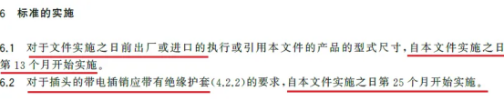 其中第6.2條規(guī)定,對于插頭的帶電插銷應(yīng)帶有絕緣護套(4.2.2)的要求,自本文件實施之日第25個月開始實施,即2027年8月1日。