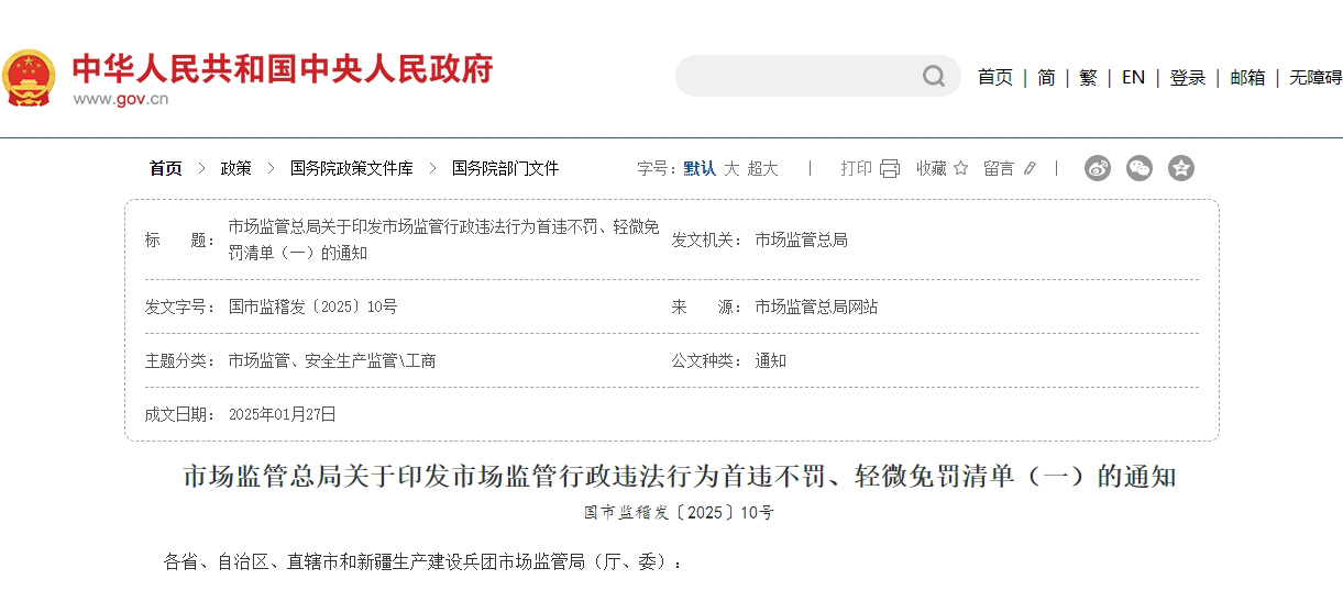 市場監(jiān)管總局關(guān)于印發(fā)市場監(jiān)管行政違法行為首違不罰、輕微免罰清單(一)的通知