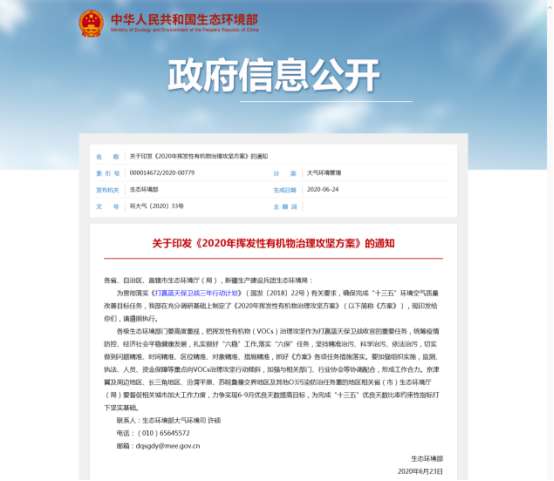 2020年6月23日,中國生態(tài)環(huán)境部官網(wǎng)公布關(guān)于印發(fā)《2020年揮發(fā)性有機(jī)物治理攻堅(jiān)方案》的通知,要求揮發(fā)性有機(jī)物(VOCs)治理攻堅(jiān)作為打贏藍(lán)天保衛(wèi)戰(zhàn)收官的重要任務(wù),確保完成“十三五”環(huán)境空氣質(zhì)量改善目標(biāo)任務(wù)。
