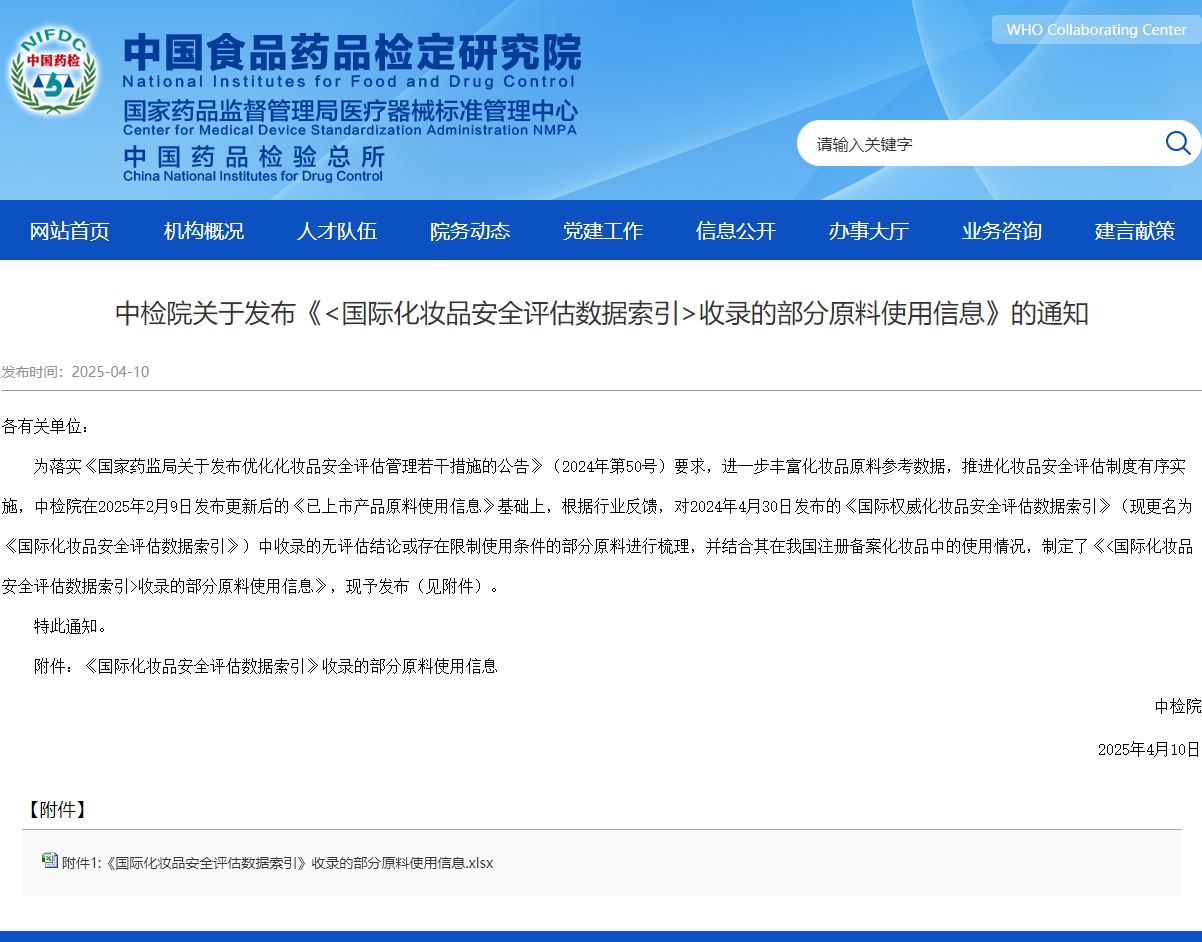 為落實《國家藥監(jiān)局關于發(fā)布優(yōu)化化妝品安全評估管理若干措施的公告》(2024年第50號)要求,進一步豐富化妝品原料參考數(shù)據(jù),推進化妝品安全評估制度有序實施,中檢院在2025年2月9日發(fā)布更新后的《已上市產品原料使用信息》基礎上,根據(jù)行業(yè)反饋,對2024年4月30日發(fā)布的《國際權威化妝品安全評估數(shù)據(jù)索引》(現(xiàn)更名為《國際化妝品安全評估數(shù)據(jù)索引》)中收錄的無評估結論或存在限制使用條件的部分原料進行梳理,并結合其在我國注冊備案化妝品中的使用情況,制定了《<國際化妝品安全評估數(shù)據(jù)索引>收錄的部分原料使用信息》,現(xiàn)予發(fā)布(見附件)。