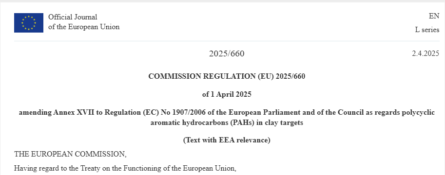 歐盟官方公報于2025年4月2日發(fā)布法規(guī)(EU) 2025/660,修訂REACH法規(guī)【(EC) No 1907/2006)】附錄XVII中關(guān)于粘土靶材中多環(huán)芳烴(PAHs)的規(guī)定。 本次修訂自歐盟官方公報上公布后的第二十天生效,即2025年4月21日開始生效。