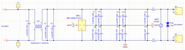 [電源輸入] → [高頻電容] → [共模扼流圈] → [電容] → [DBL] → [高頻電容]→ [差模電感]→ [壓敏電阻]