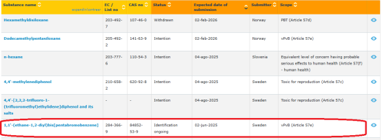 近日,歐盟化學(xué)品管理局(ECHA)發(fā)布1項物質(zhì)(十溴二苯乙烷, DBDPE)將進(jìn)行SVHC公眾評議,評議起止時間為2025年6月27日至8月11日,在此期間各利益相關(guān)方均可向ECHA提交評議意見。若該項物質(zhì)通過評議,SVHC物質(zhì)清單將增至251項。