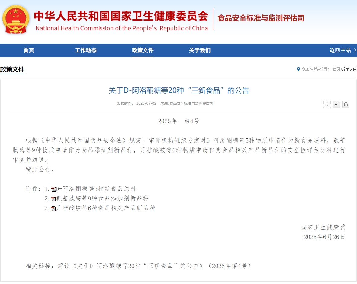 7月2日,國家衛(wèi)生健康委食品安全標(biāo)準(zhǔn)與監(jiān)測評估司發(fā)布關(guān)于D-阿洛酮糖等20種“三新食品”的公告。