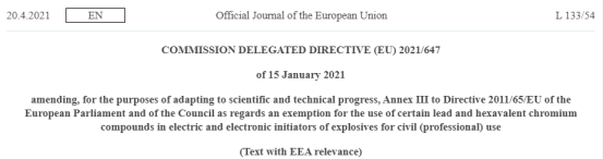 2021年4月20日,歐盟官方公報發(fā)布歐盟RoHS修訂指令(EU) 2021/647,要求在附錄三新增第45條關(guān)于民用(專業(yè))炸藥電子起爆器中的鉛及六價鉻豁免,并自2021年11月1日開始適用,有效期為5年。