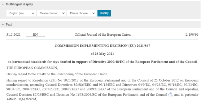 2021年5月31日,歐盟在其官方公報上發(fā)布修訂法規(guī)(EU) 2021/867,擬修訂歐盟玩具法規(guī)2009/48/EC的協(xié)調標準清單。