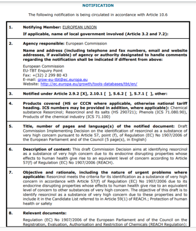 2021年6月1日,歐盟委員會(huì)向世貿(mào)組織(WTO)提交了G/TBT/N/EU/803號(hào)通報(bào),提議將間苯二酚(CAS:108-46-3 , EC: 203-585-2)列入高關(guān)注度物質(zhì)(SVHC)清單。該通報(bào)案將開(kāi)展為期60天的公眾咨詢,并于2021年7月31日截止。