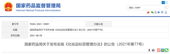 2021年6月3日,國家藥監(jiān)局在其官網(wǎng)發(fā)布了實(shí)施《化妝品標(biāo)簽管理辦法》(以下簡稱《辦法》)的公告。