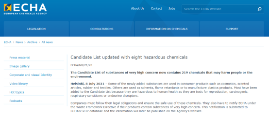 2021年7月8日,ECHA正式將第二十五批8項公眾評議物質加入SVHC候選清單中。目前,REACH法規(guī)SVHC候選清單總共219項,合計25批。