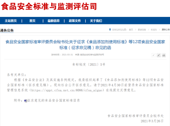 今年3月30日,食品安全國(guó)家標(biāo)準(zhǔn)審評(píng)委員會(huì)秘書處發(fā)布了關(guān)于征求《食品添加劑使用標(biāo)準(zhǔn)》等12項(xiàng)食品安全國(guó)家標(biāo)準(zhǔn)(征求意見稿)意見的函,意見征求截止到4月30日。