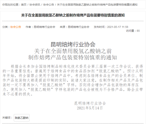 起因是某焙烤協(xié)會(huì)貼出的一則通知。里面提到,「脫氫乙酸鈉」預(yù)計(jì)從明年起全面禁用,在制作相關(guān)產(chǎn)品及包裝時(shí)不要加入「脫氫乙酸鈉」字樣,否則被視為不合格產(chǎn)品。