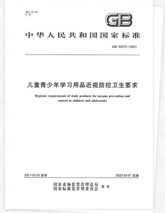 《兒童青少年學(xué)習(xí)用品近視防控衛(wèi)生要求》國家強(qiáng)制性標(biāo)準(zhǔn)(標(biāo)準(zhǔn)號:GB 40070—2021)于2022年3月1日正式實(shí)施。