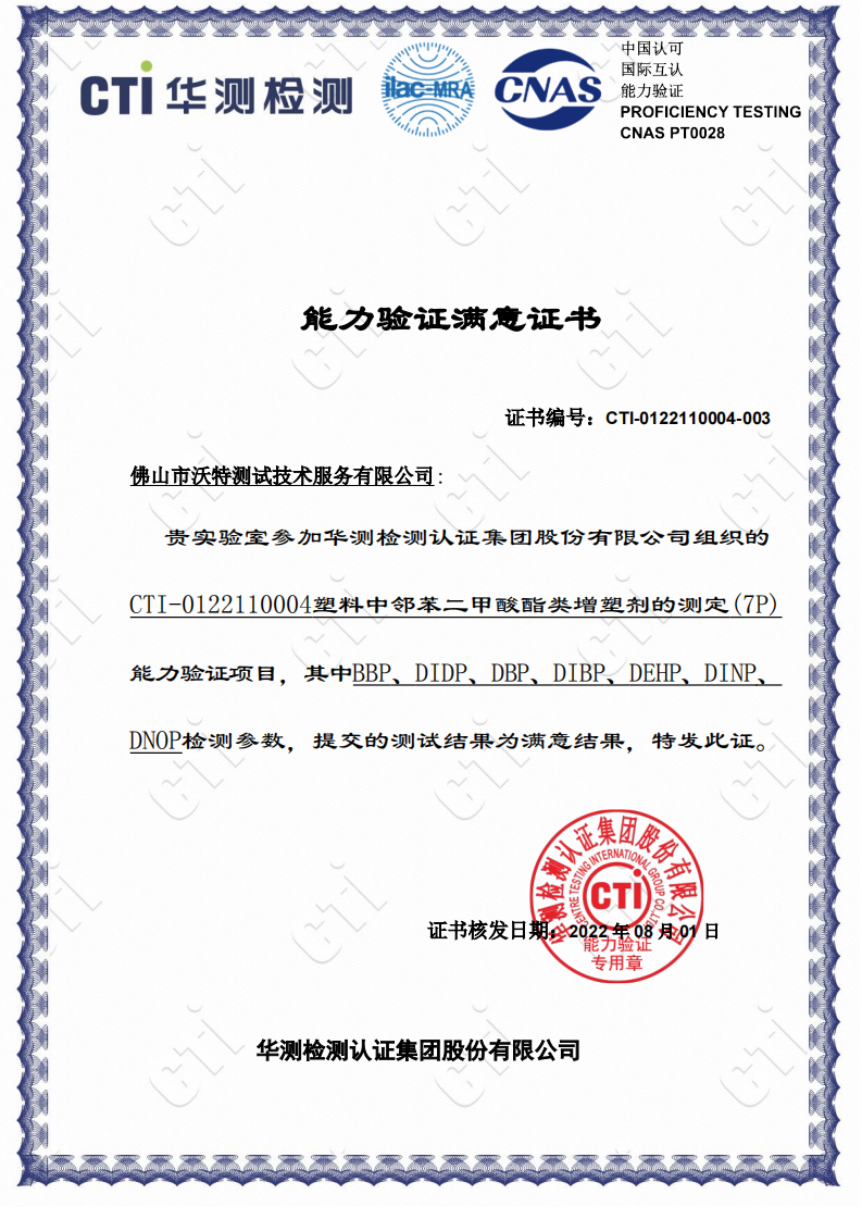 佛山沃特參加CTI-0122110004塑料中鄰苯二甲酸酯類增塑劑的測定 (7P) 獲“滿意”結(jié)果