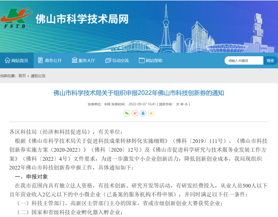 目前2022年佛山市科技創(chuàng)新券申報已開始,佛山沃特作為入選的服務(wù)機構(gòu)之一,只要您是符合佛山市科技創(chuàng)新券適用范圍的企業(yè),即可通過沃特測試下單并領(lǐng)取創(chuàng)新券,具體要求與流程詳見以下說明: