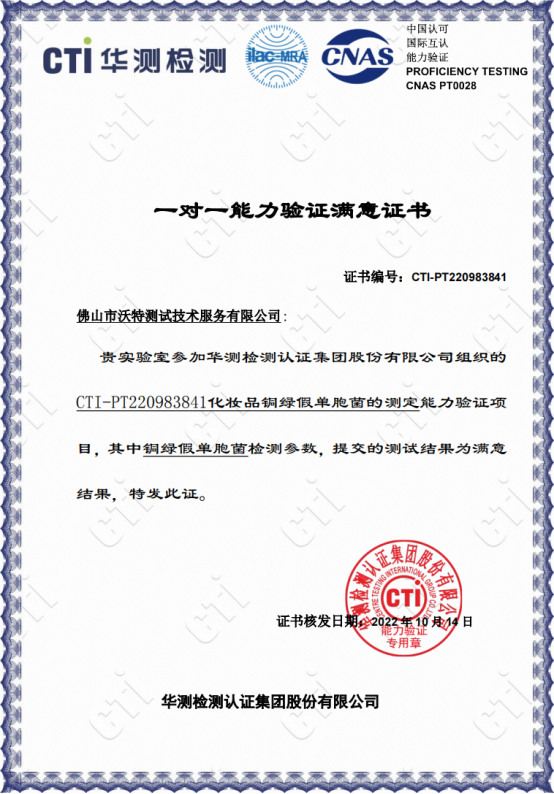 佛山沃特參加CTI-PT220983841化妝品銅綠假單胞菌的測(cè)定 獲“滿意”結(jié)果